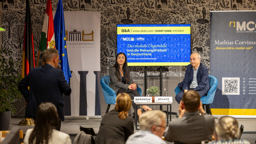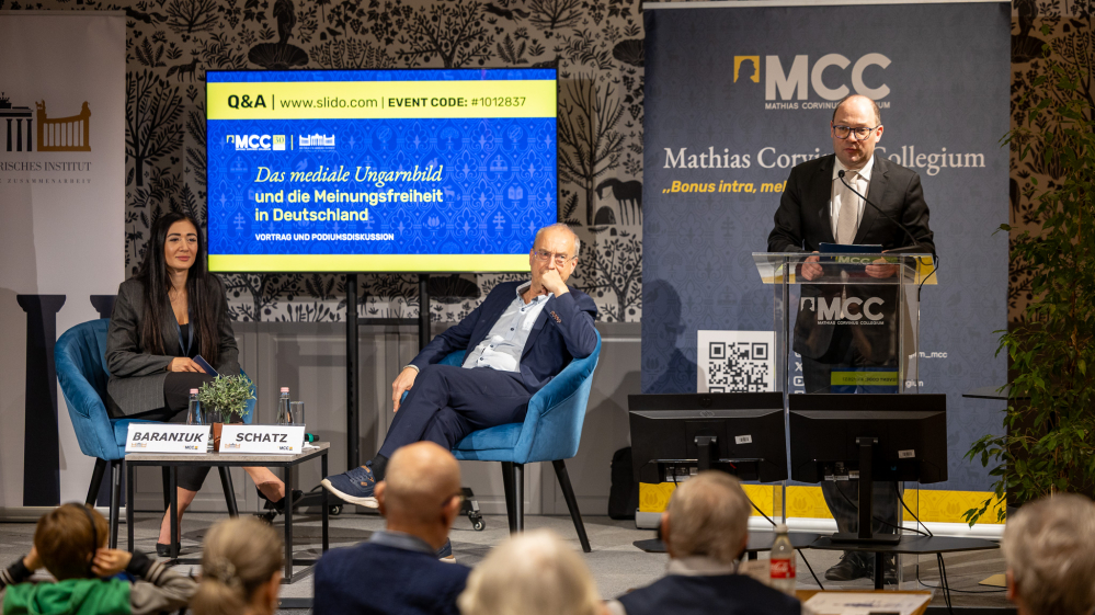 Als einen weiteren Aspekt, wie die Medien (auch unfreiwillig) zum gesellschaftlichen Vertrauensverlust beitragen, nannte Schatz die überwiegend negative Natur der deutschen Berichterstattung. Untersuchungen zeigten, dass sowohl Politiker als auch Parteien einem überwiegend negativen Medienecho ausgesetzt sind. Auch im Bereich der Wirtschaft ist dieser Trend zu beobachten – dort dominieren nicht etwa Erfolgsnachrichten und Neugründungen, sondern Insolvenzen, Standortschließungen und Entlassungen. Auch Ungarn sehe sich laut Schatz in dieser Negativberichterstattung gefangen. Dies sei jedoch weniger auf eine intrinsische Ungarnfeindlichkeit zurückzuführen, sondern zum Großteil auf die Natur der deutschen Berichterstattung. Das große Interesse des Publikums zeigte sich in einer engagierten Fragerunde; der Abend klang in persönlichen Gesprächen mit dem Referenten und Moderator aus.